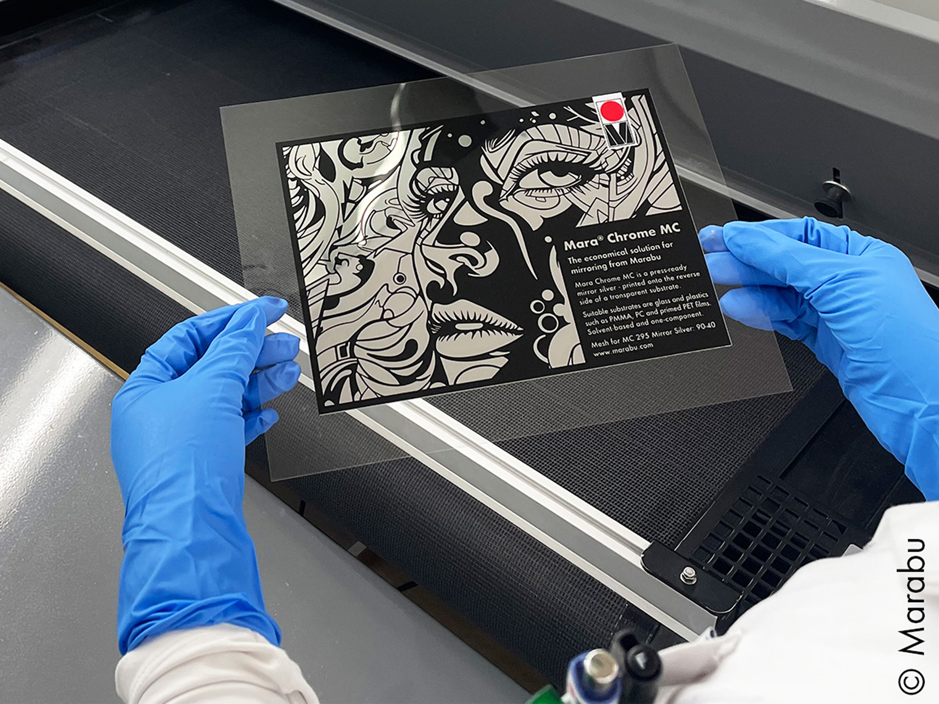 Spiegeleffekte lassen sich entweder mit kostenintensiven Verfahren wie der Verspiegelung von Glas realisieren oder im Siebdruck mit der Marabufarbe…